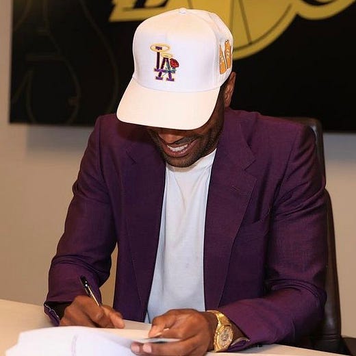 When Wayne Ellington signed his Lakers contract on Friday, he honored Kobe Bryant by wearing a Dodgers hat with halos above the L and the A and Bryant’s 8 and 24 jerseys on the side. The hat was created by PHEIT, a Compton-based company founded by designer Donte Johnson.
